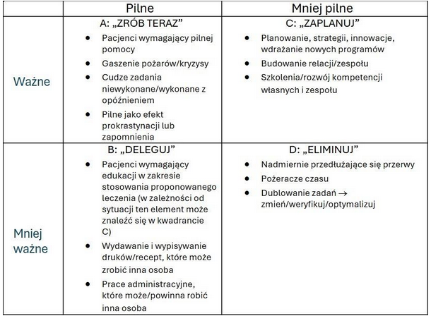 W placówkach medycznych każda minuta ma znaczenie. Zarządzanie sobą w czasie to nie tylko kwestia organizacji, ale także dobrostanu psychicznego, jakości opieki i zadowolenia pacjentów. Regularna analiza podejmowanych działań i korzystanie z takich narzędzi jak matryca Eisenhowera pozwala nie tylko tworzyć środowisko pracy sprzyjające efektywności i rozwojowi, ale także wspiera kulturę współpracy w zespole