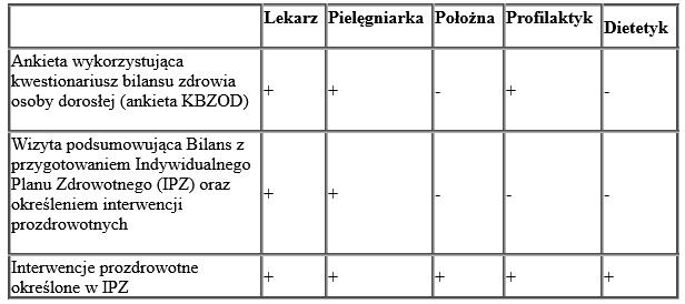 W ramach profilaktyki Moje zdrowie - bilans zdrowia osoby dorosłej, pacjenci będą mogli skorzystać z różnego zakresu świadczenia gwarantowanego i w zależności od rodzaju/etapu świadczenia, różni profesjonaliści medyczni będą uprawnieni do jego realizacji. Uprawnienia poszczególnych zawód medycznych przedstawiono w tabeli.